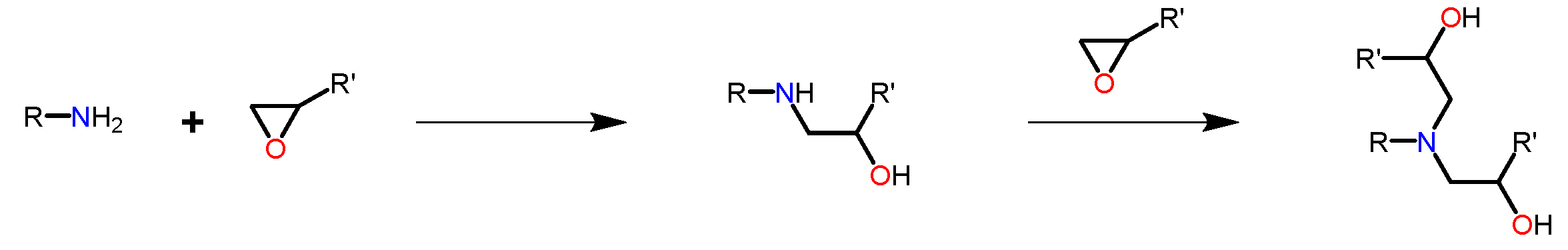 The curing of epoxy resins with polyfunctional amines is an excellent example of a step-growth polymerization resulting in a cross-linked thermoset structure. In this notebook, we will consider the reaction of a bifunctional epoxy prepolymer with a diamine. The diamine is a tetrafunctional species, since each amino hydrogen is capable of reacting with an epoxy group:
